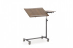 Столик прикроватный имеет специальную конструкцию, которая позволяет задвигать нижнюю часть под кровать таким образом, чтобы столешница располагалась над кроватью перед пациентом. Столик имеет поворотную столешницу и регулируется по высоте. Столешница допускает влажную дезинфекцию. Имеются 50 мм колеса.